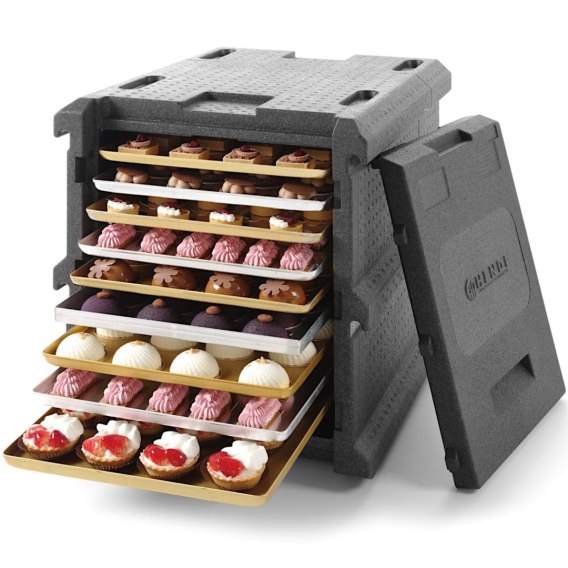 Pojemnik termoizolacyjny cateringowy HENDI jest ultra-lekki, zamykany z przodu oddzielną pokrywą, zaprojektowany do efektywnego transportu i przechowywania żywności. Z 9 prowadnicami na tacki 600x400 mm, konstrukcją umożliwiającą piętrowanie i odpornością na wysokie temperatury, utrzymuje żywność w optymalnej temperaturze, zapewniając jednocześnie bezpieczne użytkowanie. Nadaje się do mycia w zmywarce w temperaturze do 80deg;C.