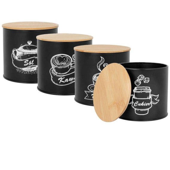 ✅ 4 pojemniki z napisami (cukier, kawa, herbata, sól) - praktyczna organizacja w kuchni.