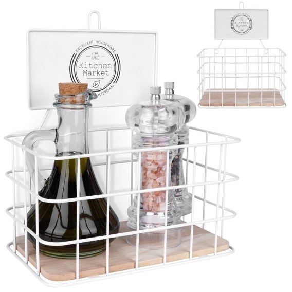 Wisząca półka kuchenna w formie koszyka. Wykonana z metalu w kolorze białym oraz z drewna dębowego. Świetnie sprawdzi się na przyprawy, przybory kuchenne, itp.