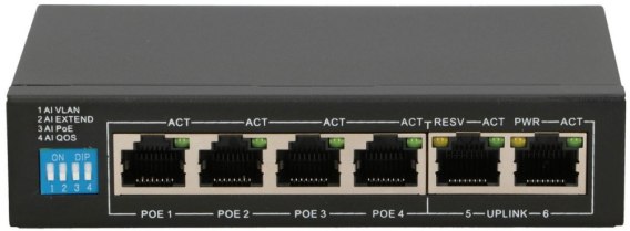 Przełącznik marki Extralink posiadający 4 porty sieciowe 10/100 PoE oraz 2 porty 10/100.