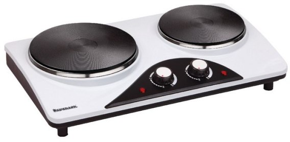 Wolnostojąca płyta elektryczna z 2 polami grzejnymi o mocy całkowitej 2500 W, z płynną regulacją temperatury oraz z antypoślizgowymi gumowymi nóżkami.