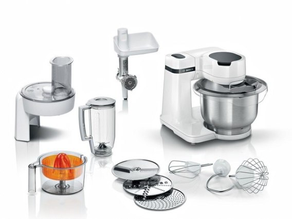 Mieszadło, Misa ze stali nierdzewnej, Szatkownica, Wyciskarka do cytrusów, Trzepaczka, Hak do zagniatania, Maszynka do mielenia, Dokumentacja, 3 tarcze tnące, Blender kielichowy