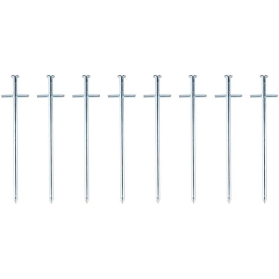 Zestaw składa się z 8 stalowych śledzi wyposażonych w specjalną poprzeczkę -uchwyt ułatwiający zamocowanie linki.