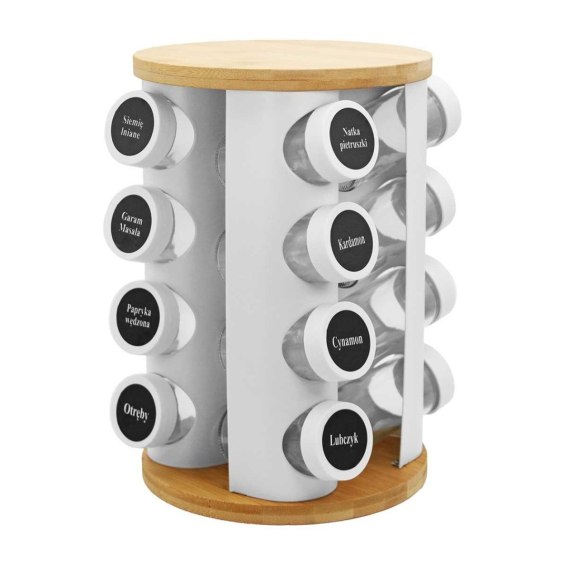 Obrotowy stojak ze stali nierdzewnej lakierowanej na kolor biały na 16 pojemników z przyprawami. Góra oraz dół stojaka wykonana z drewna.
