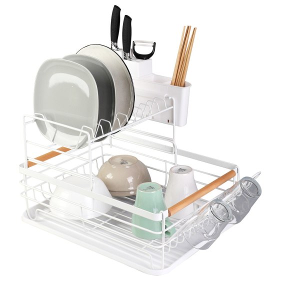 Dwupoziomowa suszarka do naczyń z ociekaczem na sztućce oraz tacą.