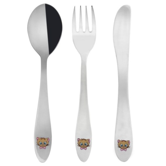 - DZIECIĘCE - Zestaw sztućców dla dzieci z motywem kotka. Służą do ćwiczenia prawidłowego spożywania posiłków. W zestawie: 1x widelec (15,5 x 2,5 cm), 1x nóż (17 x 2 cm) oraz 1x łyżka (15,5 x 3,5 cm).