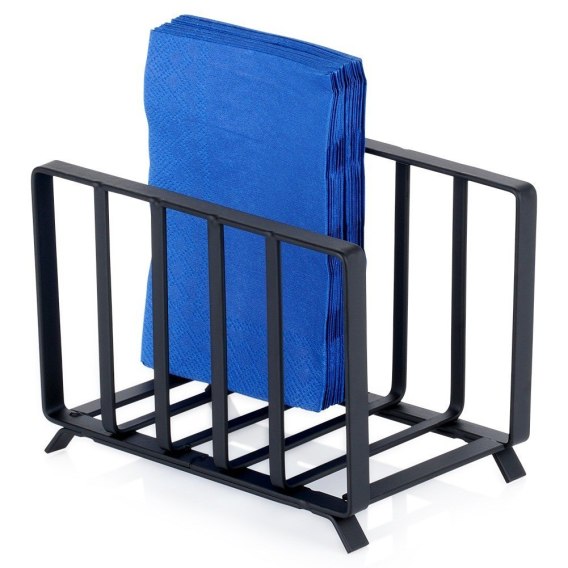 Metalowy stojak na serwetki, pomieści dużą ilość serwetek. Dzięki niemu serwetki będą zawsze na swoim miejscu. Prezentuje się bardzo elegancko, w całości utrzymany w modnym, czarnym kolorze.