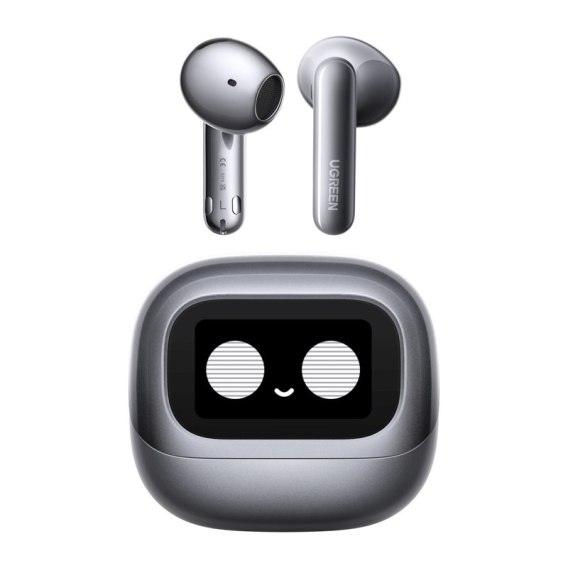 srebrne słuchawki douszne Ugreen z etui z wyświetlaczem, na czarnym tle