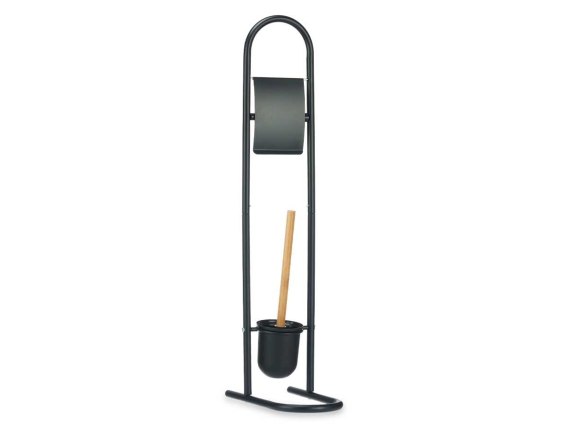 Funkcjonalny i stylowy stojak łazienkowy 2w1, który łączy uchwyt na papier toaletowy oraz szczotkę do WC z pojemnikiem. Wykonany z solidnego metalu malowanego proszkowo na czarno, prezentuje się elegancko i nowocześnie. Stabilna konstrukcja i praktyczny design sprawiają, że jest idealnym rozwiązaniem do każdej łazienki - bez wiercenia i montażu. Szczotka wyposażona jest w ergonomiczny uchwyt z naturalnego drewna bambusowego, a czarny pojemnik świetnie komponuje się z całością. Zestaw jest łatwy w czyszczeniu i zajmuje niewiele miejsca. Doskonały wybór do małych i dużych łazienek.