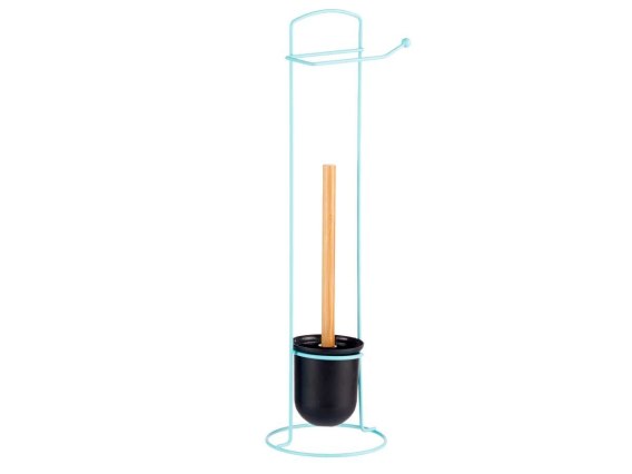 Minimalistyczny i praktyczny stojak łazienkowy 2w1 - niebieski metalowy uchwyt na papier toaletowy połączony z pojemnikiem na szczotkę WC. Dzięki lekkiej, a zarazem stabilnej konstrukcji idealnie wpasuje się zarówno w nowoczesne, jak i klasyczne wnętrza. Czarna szczotka z wymienną główką oraz bambusowy trzonek dodają naturalnego charakteru. Pojemnik szczotki jest wyjmowany, co ułatwia utrzymanie czystości. Nie wymaga montażu - wystarczy postawić w dowolnym miejscu. Świetne rozwiązanie do małych łazienek, toalet gościnnych czy domków letniskowych.