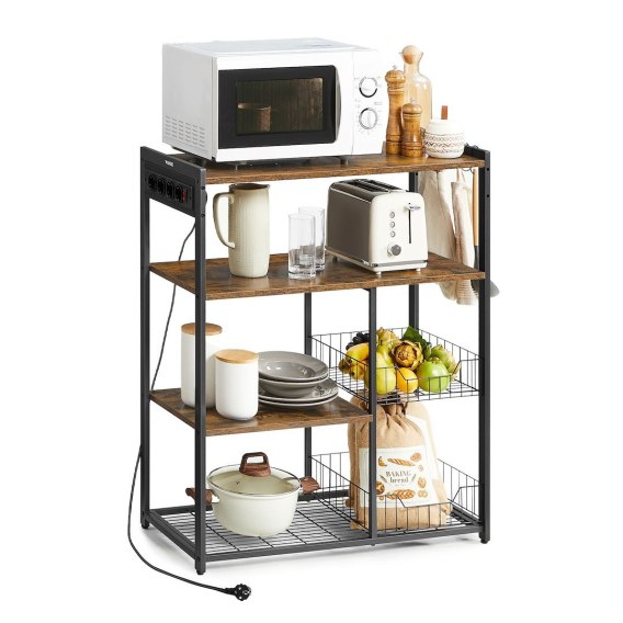 Wielofunkcyjna półka kuchenna z gniazdkami to idealne rozwiązanie dla osób szukających porządku i funkcjonalności w kuchni o ograniczonej przestrzeni. Dzięki zintegrowanej listwie zasilającej z 4 gniazdami, którą można zamontować po lewej lub prawej stronie, dzięki któremu korzystanie z urządzeń kuchennych staje się wyjątkowo wygodne. Półka wyposażona w solidną stalową ramę, trwałe półki w stylu vintage oraz regulowane nóżki zapewnia stabilne miejsce na mikrofalówkę, toster czy inne urządzenia. Dwa głębokie, metalowe kosze idealnie nadają się do przechowywania owoców, a 6 haczyków pomieści niezbędne przybory kuchenne. Półki o głębokości 35 cm są ustawione na optymalnych wysokościach, oferując dodatkową przestrzeń na talerze, puszki czy mniejsze sprzęty. To doskonałe rozwiązanie, które nie tylko porządkuje przestrzeń, ale także dodaje kuchni stylowego charakteru.