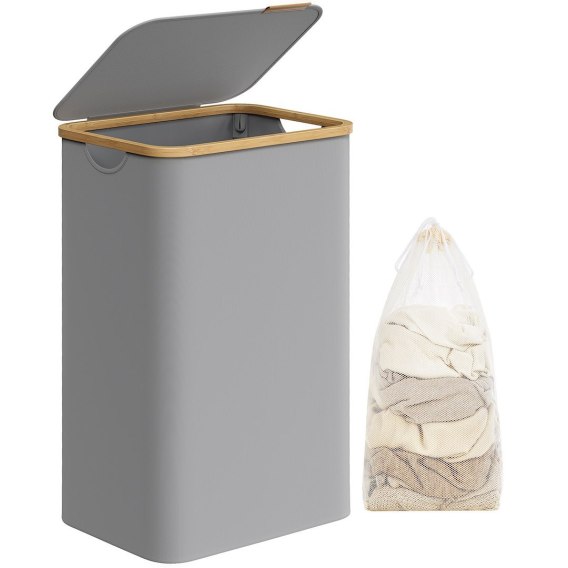 Kosz na pranie o pojemności 90 L zapewnia wystarczająco dużo miejsca na tygodniowe pranie jednej osoby, ułatwiając organizację i codzienną rutynę. Pokrywa skutecznie chroni odzież przed kurzem i zapewnia prywatność, a elegancki uchwyt z logo ze sztucznej skóry dodaje estetyki i ułatwia otwieranie. Wyjmowany worek mocowany na rzepy można szybko wyjąć i przenieść dzięki sznurkom pełniącym funkcję uchwytów, a siatkowa konstrukcja sprawia, że sprawdza się również jako worek do prania w pralce. Kosz wykonany jest z wytrzymałej tkaniny Oxford 600D, odpornej na wodę i rozerwania, dzięki czemu długo zachowuje trwałość i jest łatwy w czyszczeniu. Wewnętrzna konstrukcja wzmacniana prętami z włókna szklanego zapewnia stabilność, a bambusowe uchwyty pozwalają wygodnie przenosić kosz w dowolne miejsce. Składana forma umożliwia szybkie złożenie i przechowywanie, gdy kosz nie jest używany, a jego wszechstronność odnajdzie się w każdym pomieszczeniu.