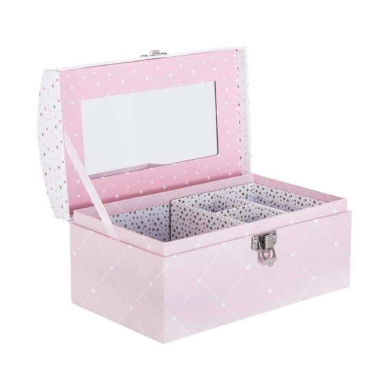 Urocza szkatułka na biżuterię, która z pewnością zachwyci każdą małą dziewczynkę. Przechowywać w niej można nie tylko biżuterię, ale również pamiątki czy inne drobiazgi. Różowy organizer posiada 4 przegródki dzięki czemu wszystkie przedmioty będą idealnie uporządkowane. W kasetce nie mogło oczywiście zabraknąć także zawsze przydatnego lusterka. Oprócz swojej funkcji praktycznej szkatułka będzie ciekawą ozdobą komody czy toaletki.