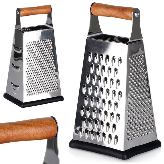 Praktyczna i wygodna tarka kuchenna z czterema różnymi ostrzami. Wykonana ze stali nierdzewnej. Idealna do tarcia i siekania różnych składników, np. warzyw i owoców.