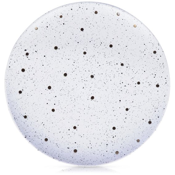 Talerz obiadowy płytki wykonany z ceramiki w matowym, białym kolorze z efektownym, nakrapianym dekorem w czarnym i złotym kolorze. Wykorzystamy go do serwowania wielu rodzajów posiłków.