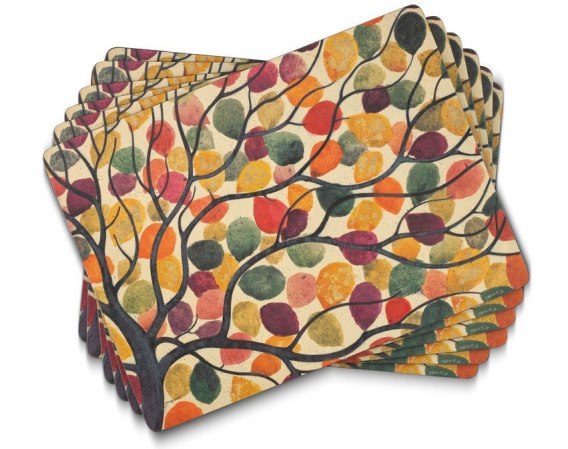 Zestaw sześciu zapewniających wspaniałą kolorystykę podkładek korkowych, ozdobionych pięknie ubarwionymi liśćmi z kolekcji Dancing Branches.
