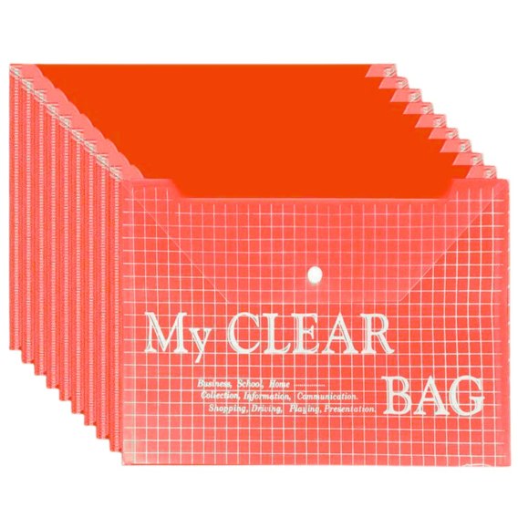 - 20 sztuk przezroczystych folderów kopertowych z zapięciem na kliknięcie w kolorze czerwonym.