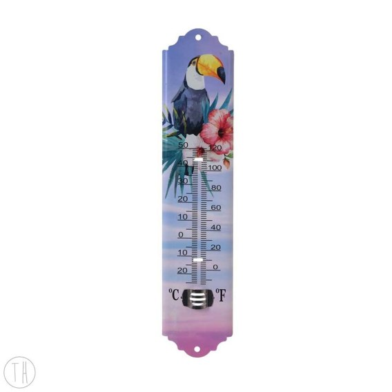 Termometr z ciekawym, kolorowym nadrukiem w tropikalnym stylu. Wykonany z metalu.