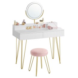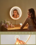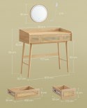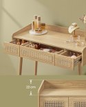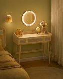 Toaletka z lustrem i oświetleniem jest idealnym rozwiązaniem dla osób ceniących funkcjonalność i elegancję. Wyposażona w okrągłe lustro z 3-tonowym oświetleniem sterowanym dotykiem, pozwala na dostosowanie jasności do światła naturalnego, ciepłego lub chłodnego, zapewniając perfekcyjny makijaż o każdej porze dnia. Trzy szuflady z efektem rattanu umożliwiają utrzymanie porządku, a podniesione krawędzie blatu zapobiegają przypadkowemu zsunięciu się przedmiotów. Wykonana z trwałej płyty MDF i oparta na drewnianych nogach z podkładkami chroniącymi podłogę, toaletka jest nie tylko piękna, ale również solidna i odporna na codzienne użytkowanie. Idealna do sypialni w stylu boho, łączy w sobie estetykę i praktyczność, stając się nieodzownym elementem wnętrza.