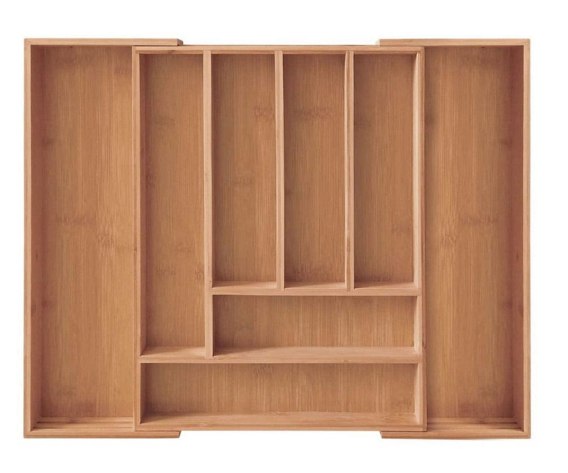 Wkład na sztućce z drewna bambusowego. Dzięki regulowanemu rozmiarowi można dopasować go do szuflad o szerokości od 31 do 52cm.