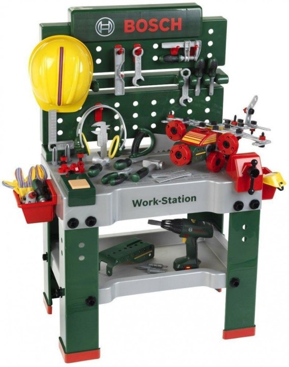 Wspaniały zestaw dla młodego majsterkowicza to zabawkowa kopia prawdziwych narzędzi Bosch stworzona przez firmę Theo Klein. Komplet składa się ze 150 elementów, takich jak: wkrętarka akumulatorowa, piła, młotek, zacisk, pilniki, klucze, obcęgi , śruby oraz solidny stojak do powieszenia wszystkiego. Zabawki są wykonane z plastiku najwyższej jakości, który gwarantuje ich wytrzymałość. Zabawa przy użyciu tego sprzętu rozwinie kreatywność dziecka i zapewni rozrywki przez wiele godzin.