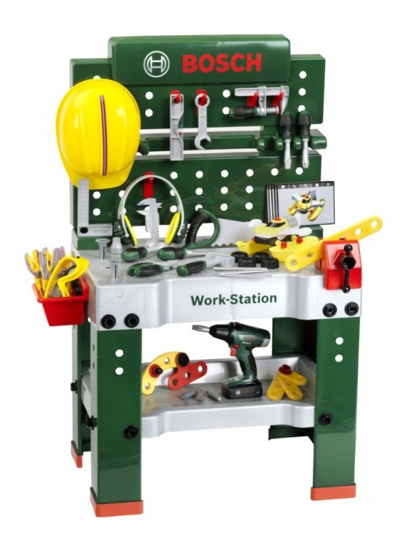 W pełni wyposażony stół warsztatowy dla dzieci jest produkowany w Niemczech na licencji Bosch. Blat oferuje liczne funkcje edukacyjne, imadło oraz praktyczne miejsca do przechowywania i schowek. Na tylnej ścianie ławki do majsterkowania oraz na półce pod blatem roboczym znalazło się miejsce na wysokiej jakości, 81-częściowe akcesoria, z których część można zawiesić na ścianie za pomocą praktycznych haczyków: elektryczna wkrętarka akumulatorowa dla dzieci, śrubokręt płaski i krzyżakowy, klucz, grzechotka, szczypce i pilnik, młotek, piła i skala, kwadrat, linijka i zacisk śrubowy. Dzieci uczą się umiejętnie posługiwać się śrubami, nakrętkami i elementami do skręcania w różnych rozmiarach i kształtach oraz zwracać uwagę na bezpieczeństwo dzięki zabawkowym hełmom i okularom ochronnym, fajnym nausznikom i rękawiczkom. Szczególną frajdę sprawia pojazd do samodzielnego montażu, który można skręcić i ponownie rozkręcić na stanowisku pracy. W ten sposób pokój dziecięcy staje się warsztatem! Wystarczy założyć kask i okulary ochronne, założyć rękawice i można rozpocząć piłowanie, młotkowanie i wkręcanie. Imadło pomaga ciężko pracującym projektantom i przytrzymuje listwy, które należy przymocować za pomocą gwoździ lub śrub. Dostępna jest także wkrętarka akumulatorowa, która za pomocą światła i dźwięku pozwala skręcić wszystko, co maluchy chcą połączyć w coś dużego, a kiedy cała praca zostanie ukończona, wszystko można szybko uporządkować na hakach i w pudełkach.