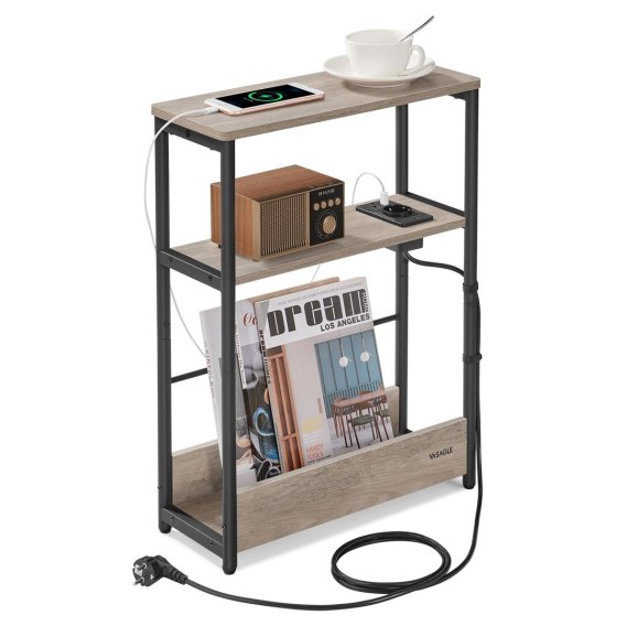 Funkcjonalny 3-poziomy stolik boczny w szarej kolorystyce i atramentowej czerni jest praktycznym dodatkiem do sypialni, salonu lub biura. Smukły design sprawi, że łatwo znajdzie miejsce nawet w ciasnych przestrzeniach, zwłaszcza do postawienia obok sofy lub łóżka. Posiada 3 półki, które pozwalają na efektywne wykorzystanie ograniczonej przestrzeni, a jedna z nich jest wyposażona w gniazdko oraz 2 porty USB, umożliwiając jednoczesne ładowanie telefonu, tabletu i innych elektronicznych urządzeń. Dzięki dostarczonemu kablowi o długości 2 metrów, elastycznie można ustawić stół w dowolnym miejscu. Niezależnie od tego, czy będzie wykorzystywany jako stolik nocny na położenie książek, dekoracji, czy innych potrzebnych przedmiotów, ale również doda przestrzeni nowoczesny przemysłowy akcent dopasowujących się do rożnych aranżacji wybranemu wnętrzu.