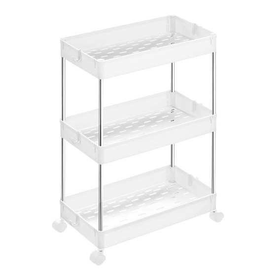 Smukły wózek do przechowywania na kółkach sprawdza się w kuchni, łazience, pralni czy biurze, mieszcząc się w wąskich szczelinach i oszczędzając cenną przestrzeń. Trzy poziomy półek oferują dużo miejsca na przyprawy, środki czystości czy kosmetyki, a możliwość wyjęcia półek pozwala na użycie ich osobno na blacie lub w szafkach. Konstrukcja z mocnych rur ze stali nierdzewnej zapewnia stabilność i trwałość przy codziennym użytkowaniu, cztery obrotowe kółka 360° ułatwiają manewrowanie w ciasnych miejscach oraz sprzątanie. Wózek wyposażono w 6 regulowanych haczyków, które można przymocować z boku lub z przodu, umożliwiając przechowywanie ręczników, szczotek lub akcesoriów kuchennych w zasięgu ręki. Dzięki temu praktycznemu rozwiązaniu organizacja przestrzeni staje się łatwa i efektywna, bez zajmowania dużej powierzchni.