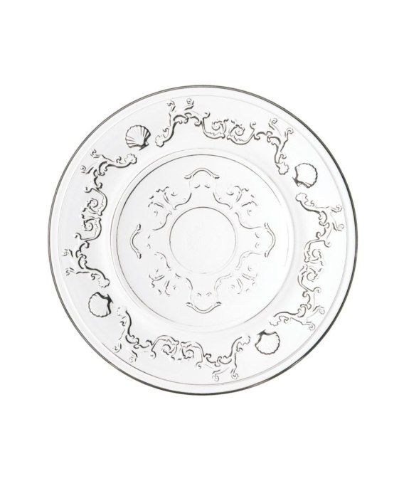 Talerz deserowy z bogato zdobionej kolekcji Versailles (Wersal) marki La Rochère, wykonany z prasowanego szkła, ozdobiony reliefowymi motywami barokowymi kwiatów, pnącej się roślinności i przegrzebków. Idealnie sprawdzi się do serwowania zimnych i gorących deserów, jak i owoców.