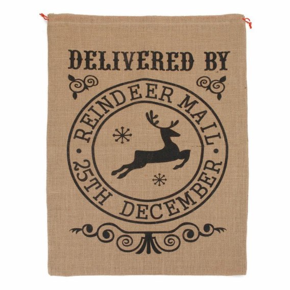 Worek na prezenty z czarnym nadrukiem Torba jutowa na prezenty od św. Mikołaja z wiązaniem i świątecznym motywem o wymiarach 72x