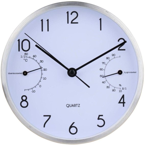 - z cyframi arabskimi wskazującymi każdą godzinę,z termometrem i higrometrem
