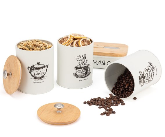 Pojemniki kuchenne zostały zaprojektowane tak, aby spełniać wszystkie potrzeby Twojej kuchni. Są odporne na uszkodzenia mechaniczne oraz łatwe do utrzymania w czystości.Wykonane z metalu malowanego proszkowo na kolor biały. Pokrywy wykonane z drewna bambusowego. W pokrywie maselniczki nożyk do smarowania umieszczony w wyprofilowanym zagłębieniu.