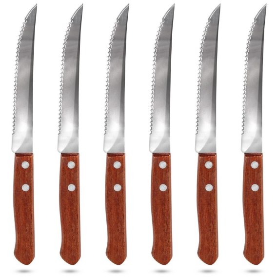 Zestaw sześciu noży do steków z ząbkowanym ostrzem. Solidne uchwyty zapewnią wygodę i komfort podczas użytkowania. Przydatne podczas grillowanie oraz w domu.