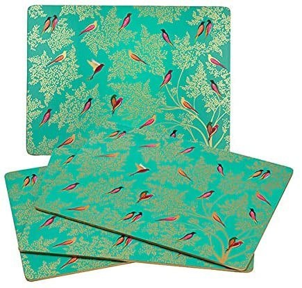 Zakochaj się w tym zestawie czterech wyrafinowanych zielonych podkładek, prezentujących oszałamiający wzór zaczarowanego ogrodu wypełnionego ptakami i złotymi liśćmi z kolekcji Green Birds.