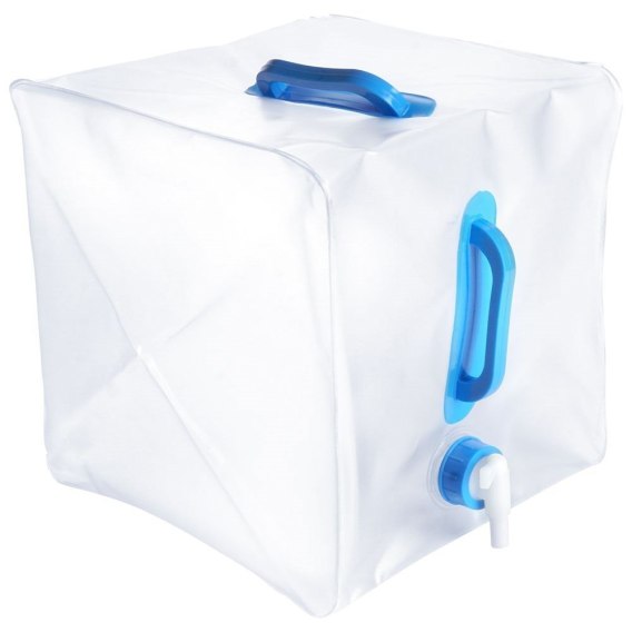 - SKŁADANY - Zbiornik na wodę pitną wyposażony w kranik. Zbiornik ma pojemność 20 litrów. Po napełnieniu ma wymiary 27 x 26 x 27 cm.