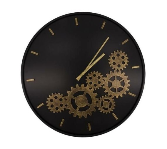 Efektowny zegar ścienny o średnicy 60 cm to połączenie funkcjonalności i nowoczesnego, industrialnego designu. Czarne tło i złote detale - w tym ozdobne koła zębate - tworzą unikalną kompozycję, która nadaje wnętrzu charakteru i wyrazistości. Minimalistyczne oznaczenia godzinowe oraz smukłe wskazówki podkreślają surowy styl i ułatwiają odczyt godziny. Zegar świetnie sprawdzi się w salonie, biurze, loftowym korytarzu lub nowoczesnej kuchni. Solidna, metalowa konstrukcja zapewnia trwałość i stabilność, a ponadczasowa kolorystyka doskonale komponuje się z innymi elementami wystroju. Ten zegar to nie tylko praktyczne urządzenie do odmierzania czasu, ale również wyjątkowa dekoracja ścienna, która wprowadzi nutę stylu i dynamiki do każdego wnętrza.