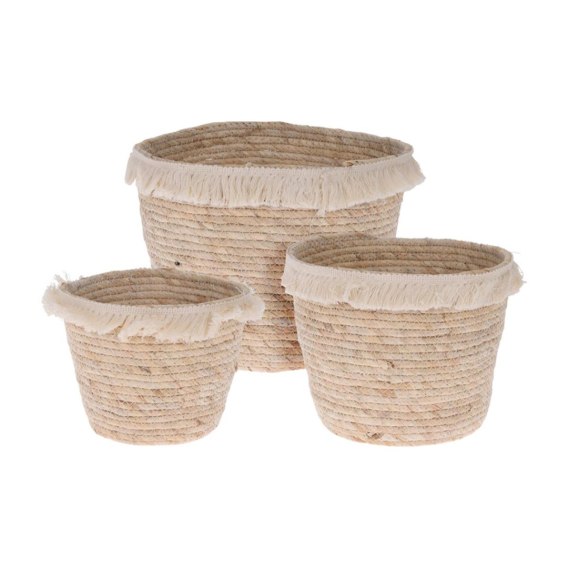 Komplet trzech plecionych koszy, donic w naturalnym, beżowym kolorze. Kosze ozdobione dekoracyjnymi frędzlami. Doskonałe do przechowywania rzeczy codziennego użytku, zabawek, gazet, ręczników, kosmetyków. Idealnie posłużą jako donica, osłonka na kwiaty. Dekoracyjny charakter sprawia, że pojemniki prezentują się pięknie w każdej aranżacji szczególnie w stylu boho, etno czy skandynawskim.