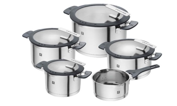 Witaj na wyższym poziomie gotowania: seria Simplify firmy ZWILLING to design i funkcjonalność. 5-częściowy zestaw garnków zachwyca nie tylko niezwykłym wyglądem - każdy rondel w zestawie zachwyca również innowacyjnymi właściwościami. Na 5-częściowy zestaw naczyń składają się 3 garnki wysokie (o średnicy 16, 20 i 24 cm), garnek niski o średnicy 20 cm oraz rondel o średnicy 16 cm. Ponadto wszystkie garnki, z wyjątkiem rondelka, są wyposażone w dopasowaną pokrywkę. Sito z dwoma otworami różnej wielkości jest zintegrowane z szarym silikonowym brzegiem, dzięki czemu płyn można wylewać bez dodatkowych akcesoriów. Oznaczenie X na wieczku wskazuje optymalne jego położenie, aby ograniczyć ulatnianie się pary. Dzięki zintegrowanemu uchwytowi szklaną pokrywkę z funkcją nalewania można przymocować do garnka podczas gotowania i nie trzeba już jej odkładać na bok. Dzięki zestawowi garnków Simplify nie musisz martwić się gorącymi uchwytami podczas gotowania: uchwyty są pokryte miękkim w dotyku silikonem - dla łatwej obsługi podczas gotowania. Naczynie wykonane ze stali nierdzewnej 18/10 jest wysokiej jakości, a wielowarstwowe dno SIGMA Classic+ zapewnia idealne rozprowadzanie ciepła. Wszystkie pięć garnków można myć w zmywarce i nadają się do indukcji.