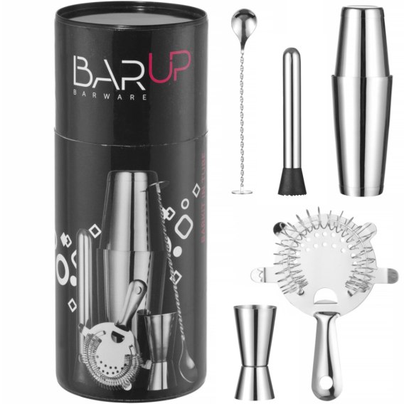 Zestaw barmański w tubie firmy BarUp, to starannie przemyślany i skomponowany zestaw podstawowych, profesjonalnych i niezbędnych narzędzi barmana. Zamknięty jest w estetycznym, tekturowym pudełku w formie tuby, dzięki czemu to również wspaniały pomysł na prezent dla pasjonatów sztuki barmańskiej. Zestaw 5 elementów został wykonany ze stali nierdzewnej AISI 201. Shaker bostoński Tin-on-Tin posiada 2 kubki z obciążeniem, o pojemnościach 500 ml i 800 ml. Klasyczny jigger o pojemnościach 50 ml i 25 ml. Sitko barmańskie Hawthorne z profilowanym uchwytem oraz demontowaną sprężyną (ułatwia czyszczenie, można jej też używać jako „spring whisk#8221;) idealnie pasuje do shakera, doskonale odcedza drobne kawałki lodu, owoców i ziół. Muddler (moździerz barmański) z ząbkowaną powierzchnią, do szybkiego rozgniatania kawałków owoców i ziół. Końcówka muddlera wykonana jest z polipropylenu (PP). Spiralna łyżka barmańska o długości 27 cm i pojemności 5 ml z muddlerem (końcówka w kształcie dysku) do szybkiego mieszania drinków z lodem bez rozwadniania ich, do wlewania napojów gazowanych bez spieniania oraz tworzenia warstwowych koktajli. Zestaw umieszczony jest w kartonowej tubie z elegancką grafiką. Wszystkie elementy zestawu nadają się do mycia w zmywarce.