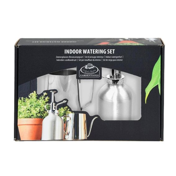 Praktyczny komplet, w skład którego wchodzą rozpylacz wykonany z aluminium oraz konewka ze stali nierdzewnej.