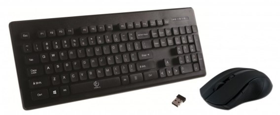 Zastaw zawierający bezprzewodową klawiaturę oraz mysz. Klawiatura posiada 104 klawisze.