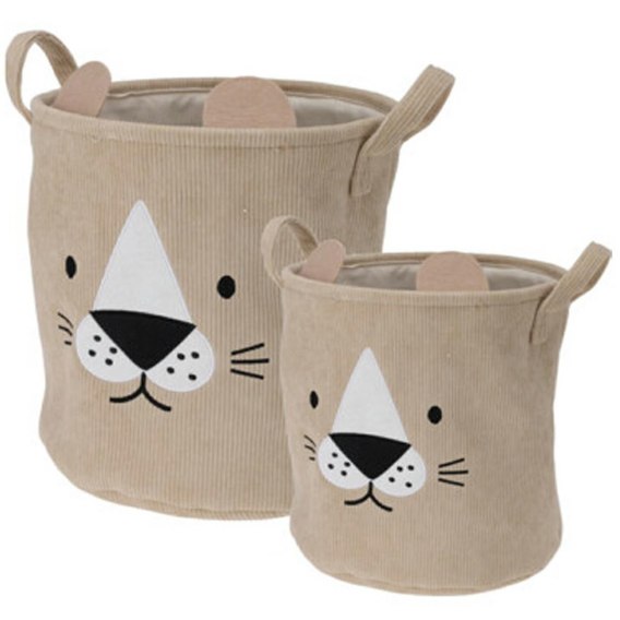 Zestaw dwóch uroczych koszy do przechowywania wykonanych z miękkiego sztruksu to doskonałe rozwiązanie do organizacji dziecięcego pokoju. Kosze ozdobione są haftowanymi buźkami zwierzątek, co dodaje im wyjątkowego uroku. Wyposażone w praktyczne uchwyty, ułatwiają przenoszenie i codzienne użytkowanie.