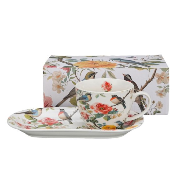 zestaw śniadaniowy APRIL, filiżanka jumbo, filiżanka z dużym spodkiem, porcelana w ptaki i kwiaty, filiżanka na śniadanie, zestaw porcelanowy, filiżanka DUO, filiżanka ozdobna, zestaw prezentowy